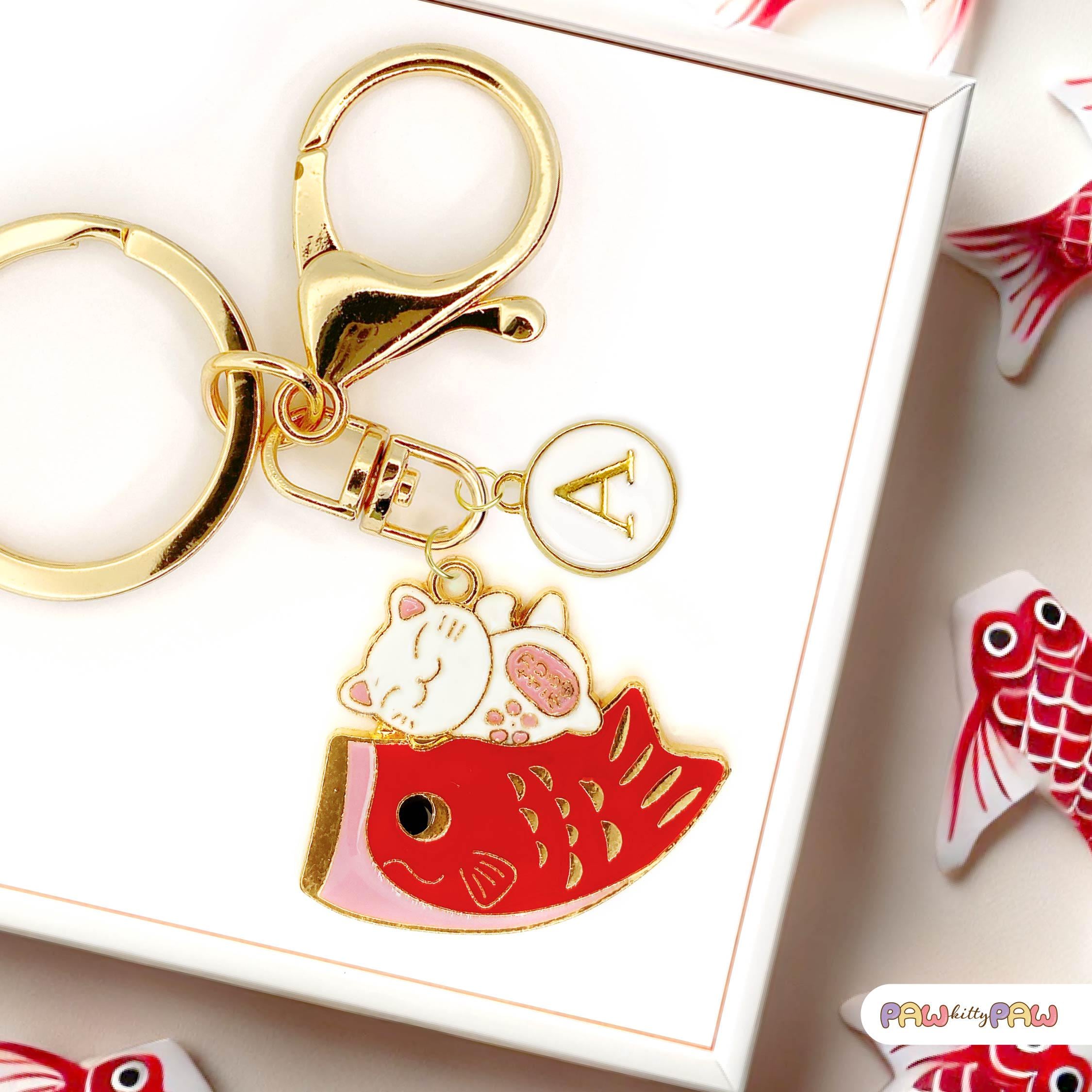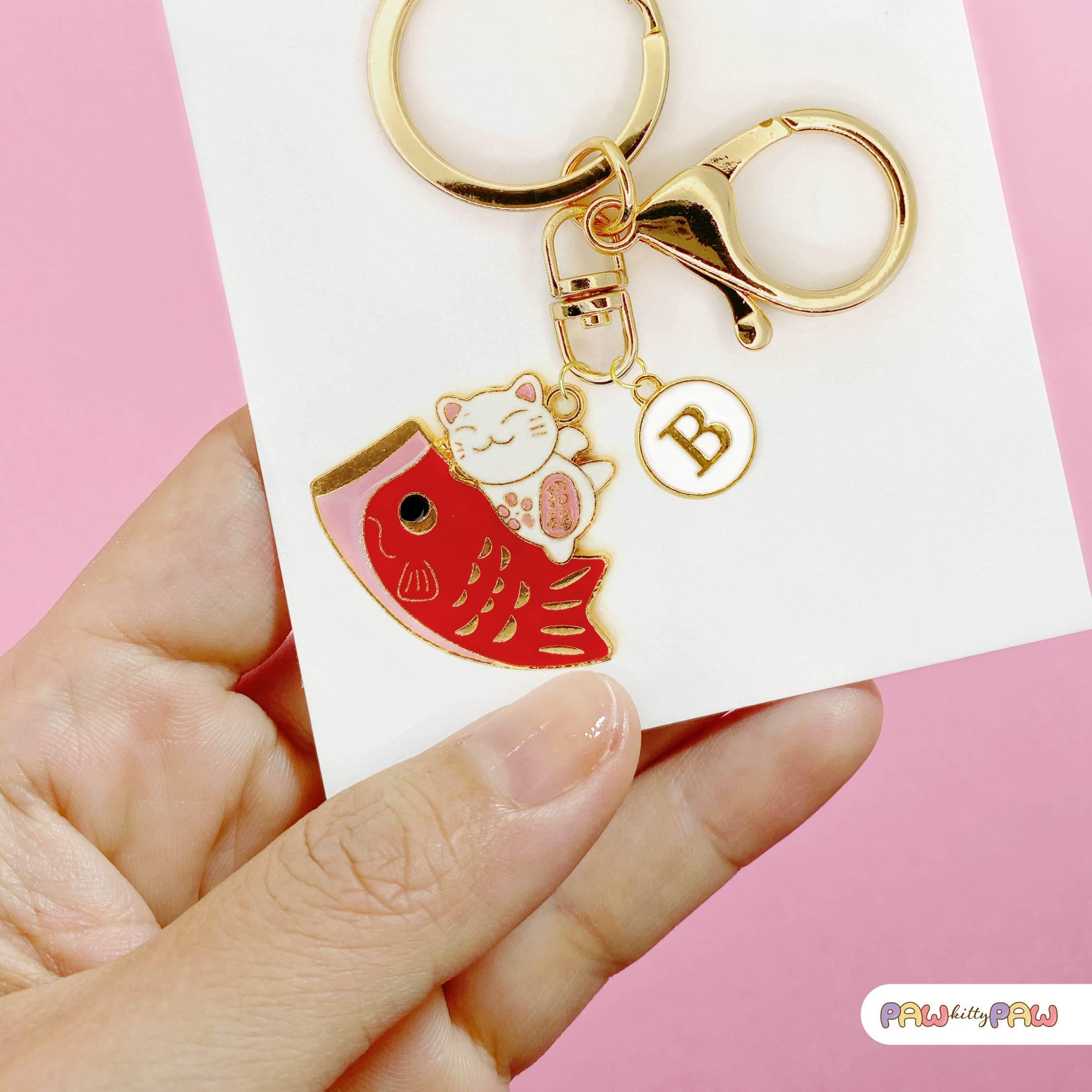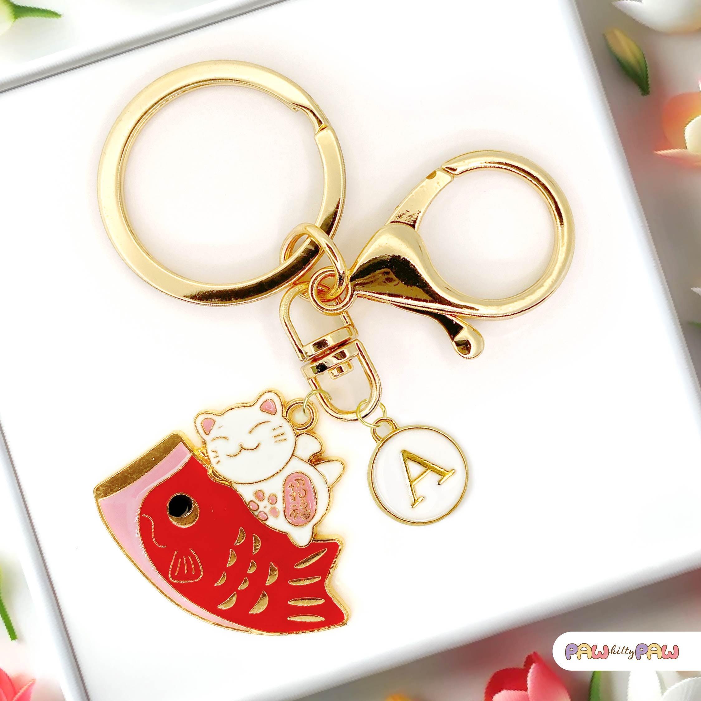 🍣🐾 Say hello to extra luck and cuteness with this playful lucky cat and fish keychain! Featuring a smiling maneki neko perched on a bright red fish, this Japanese-inspired charm adds fun and fortune to your keys, purse, or backpack. Personalize it with your favorite initial for a unique touch and carry some kawaii magic wherever you go!