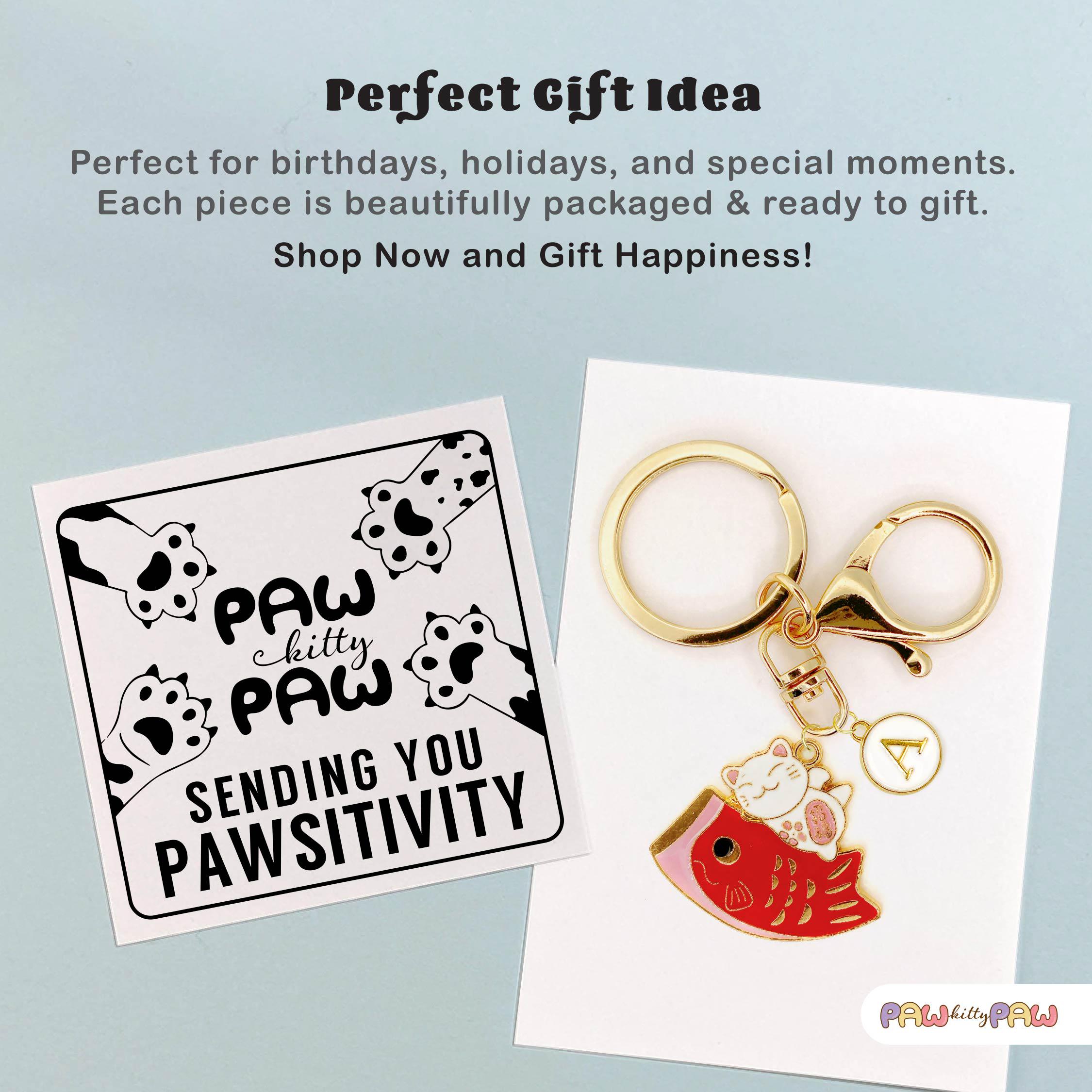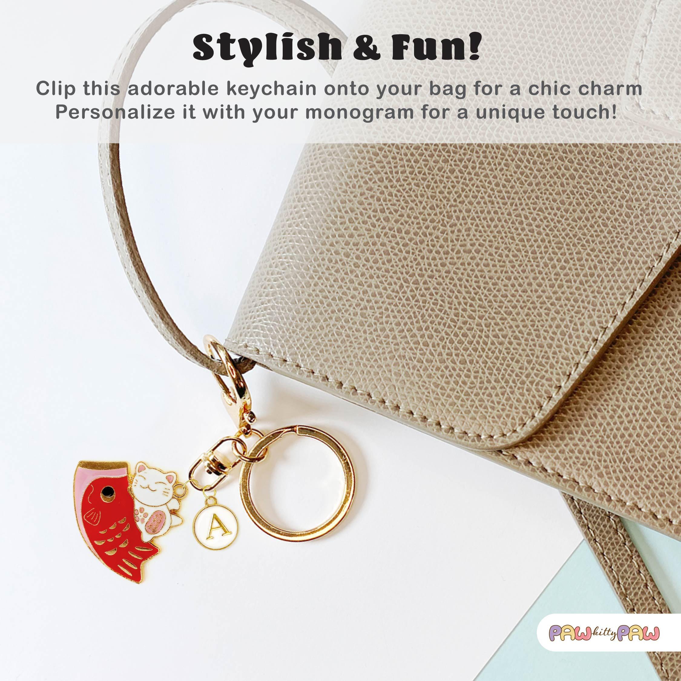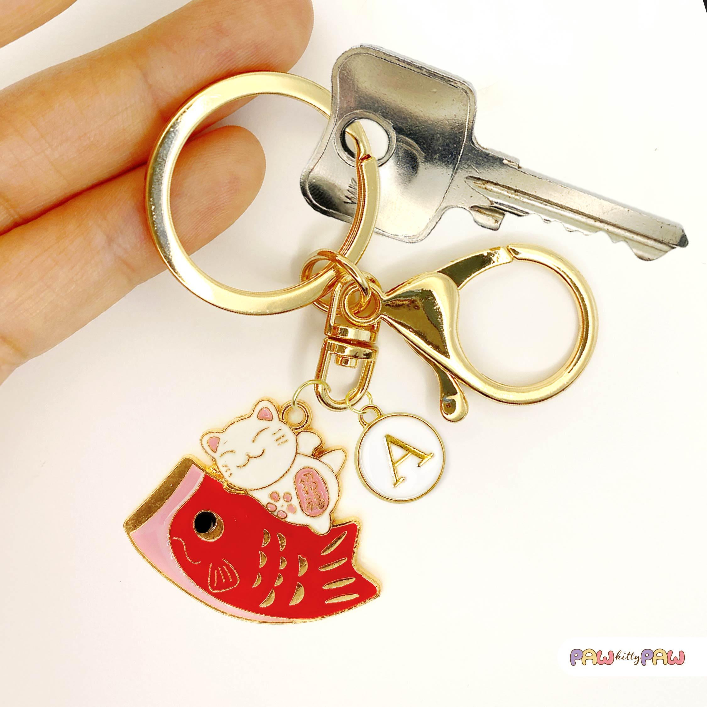 🍣🐾 Say hello to extra luck and cuteness with this playful lucky cat and fish keychain! Featuring a smiling maneki neko perched on a bright red fish, this Japanese-inspired charm adds fun and fortune to your keys, purse, or backpack. Personalize it with your favorite initial for a unique touch and carry some kawaii magic wherever you go!