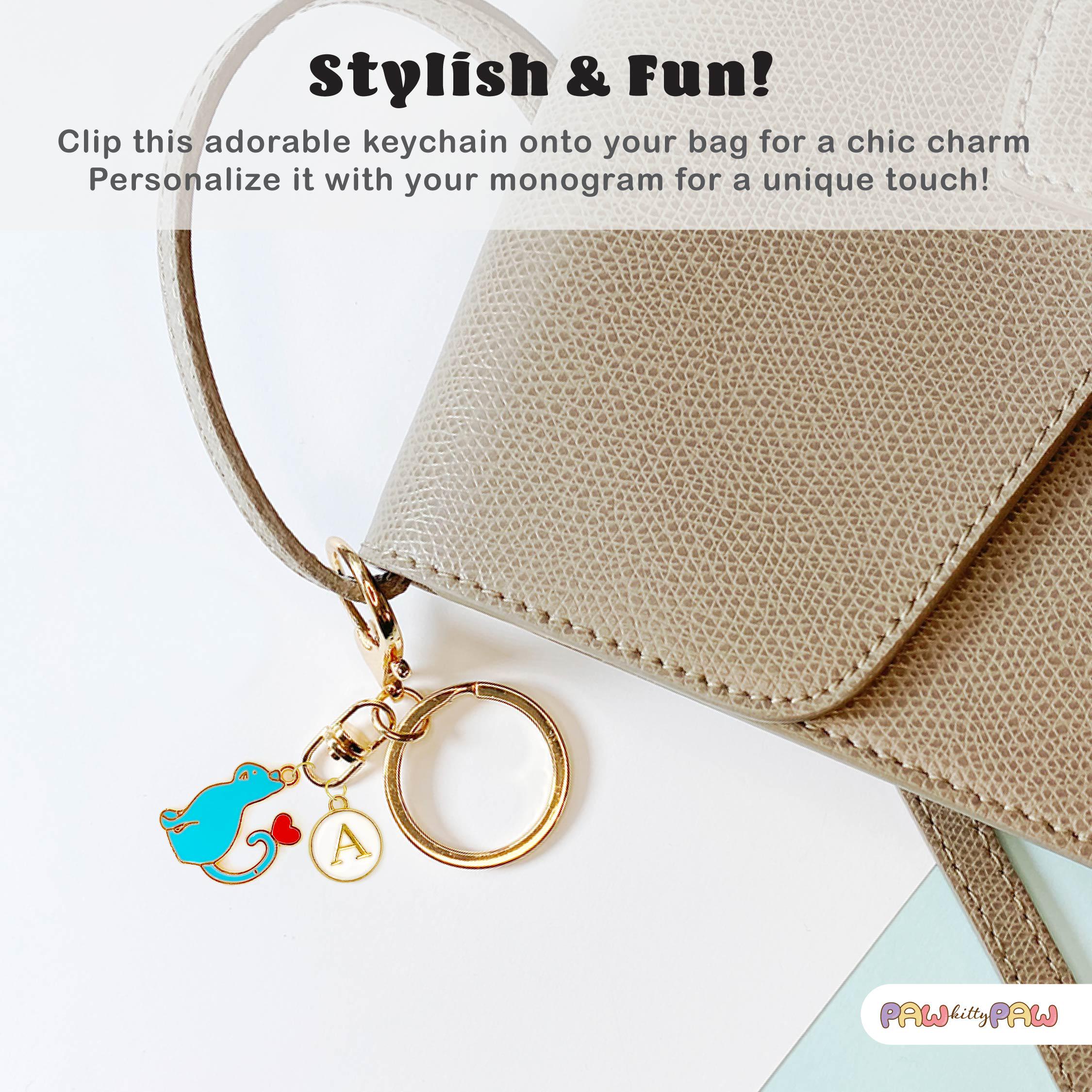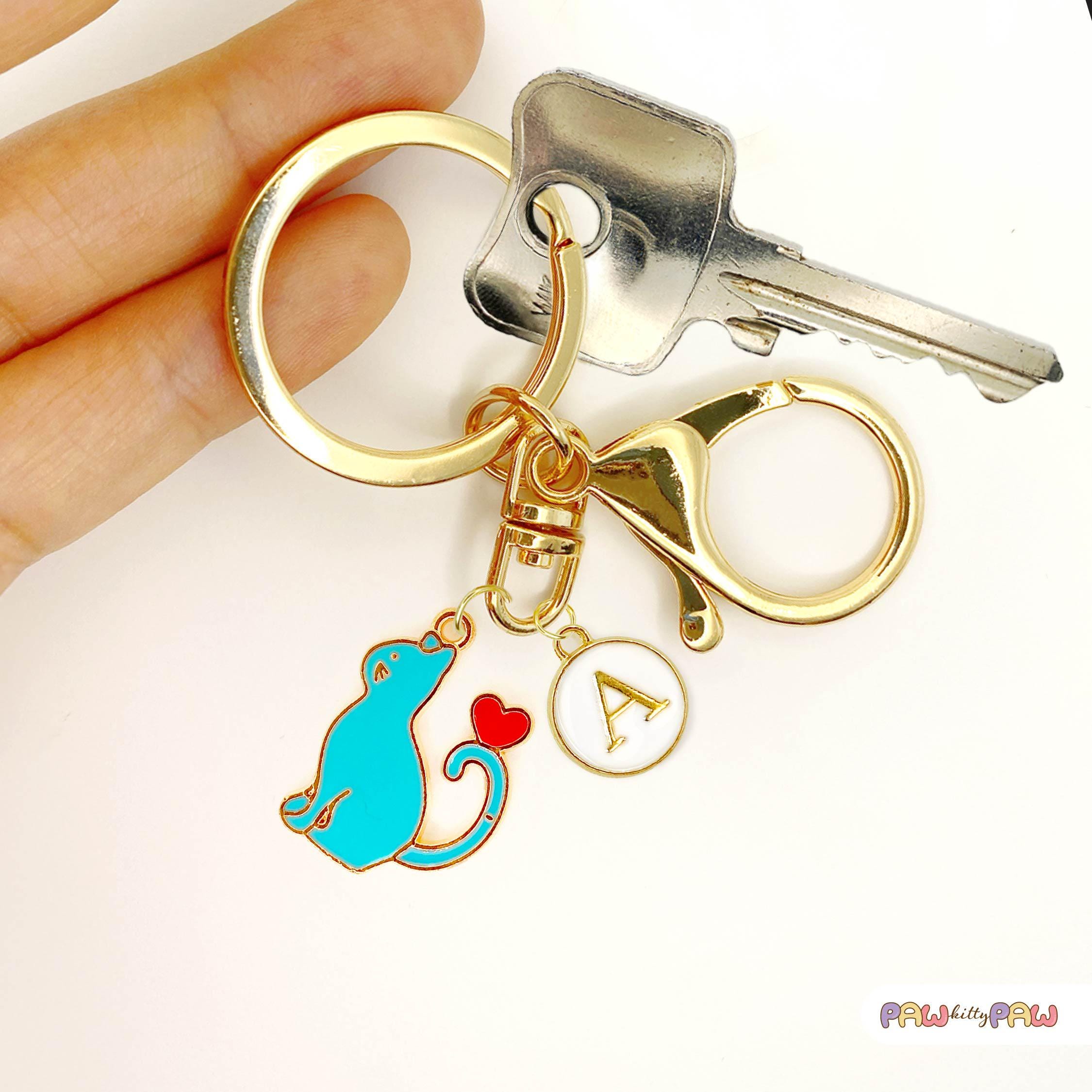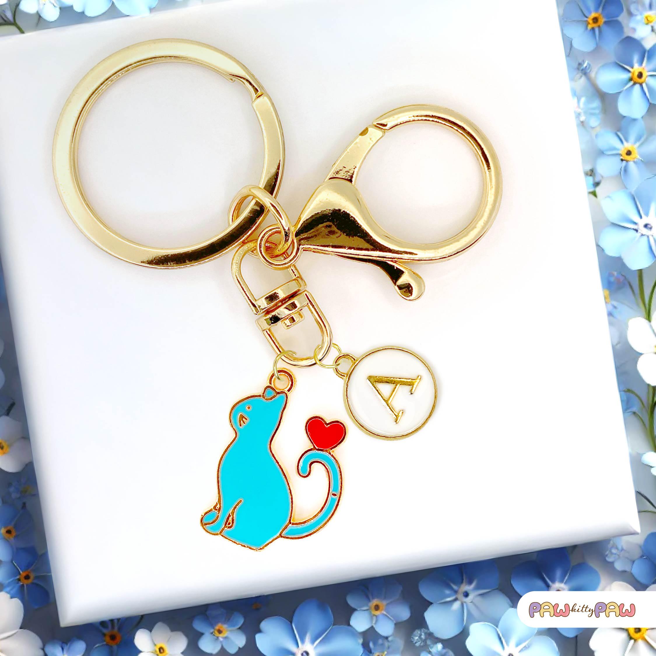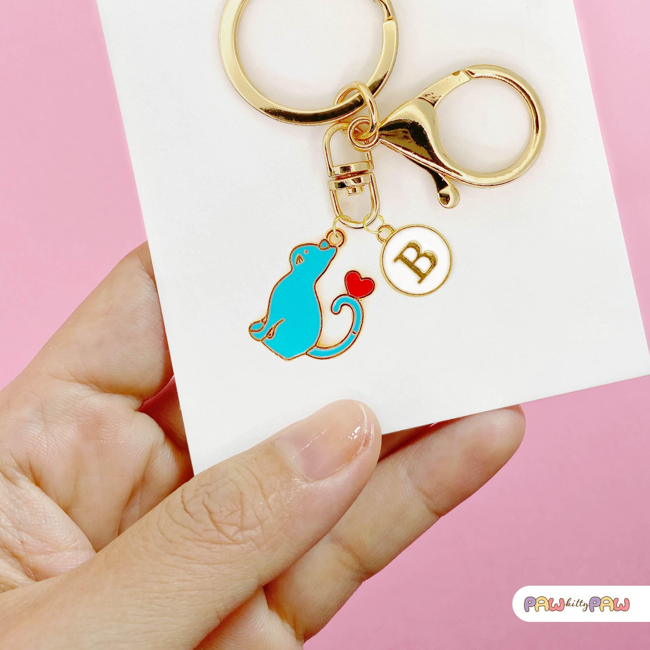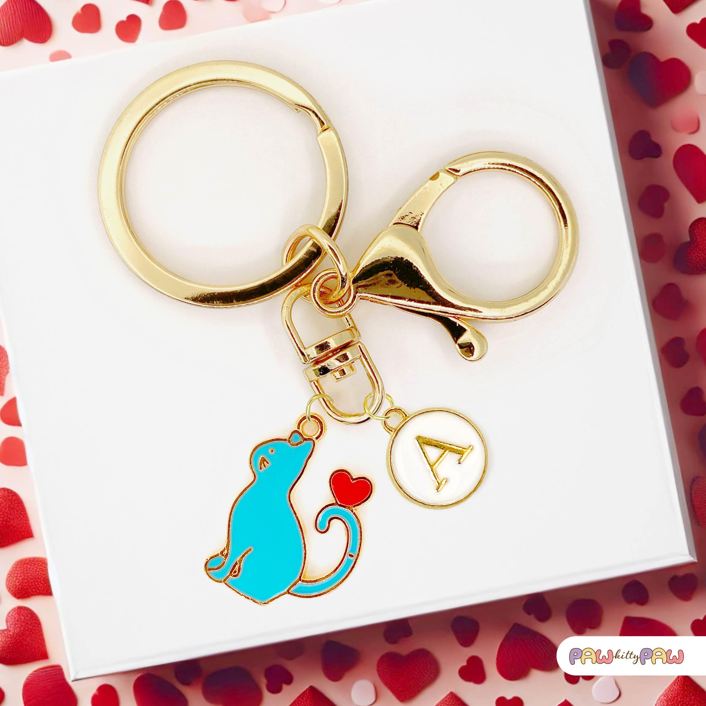 Say hello to your new favorite charm! 💙 This blue cat keychain is a kawaii cat accessory that brings a pop of bright color and fun to your day. Featuring a quirky cat charm with a playful heart tail cat charm, this enamel kitty charm is a cute animal charm and love themed keychain all in one. The vibrant blue feline holder comes with a personalized clip so you can add your own initial, turning it into a truly custom cat gift.